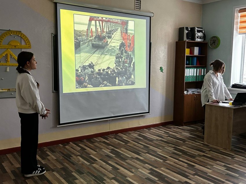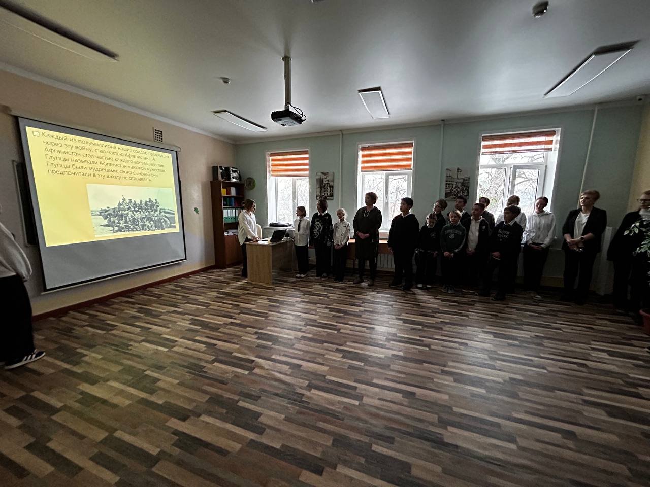 В нашей школе проведена линейка для учащихся в честь 35-летия вывода советских войск из Народной Республики Афганистан. Зам.директора по ВР Селеменевой Е.В. был организован показ документального фильма "Хроника войны", а учащиеся 7 класса подготовили стихотворение и презентацию, где рассказали о войне.