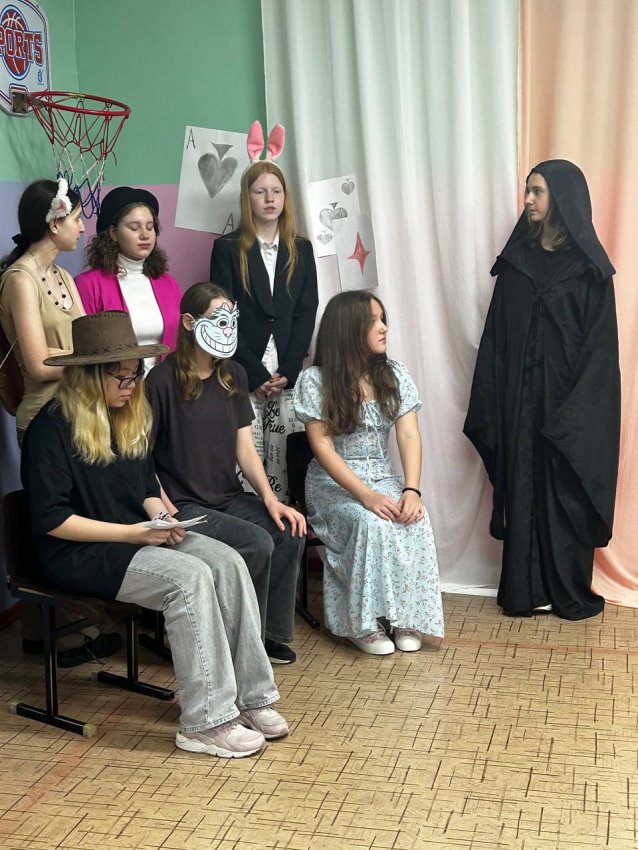 Учителем английского языка Гофман М.А. и учениками 7 класса была поставлена сказка Л.Кэролла "Алиса в стране чудес" на английском языке. Ученики надели потрясающие костюмы и по-настоящему вжились в образ, воплощая эту классическую историю в жизнь.