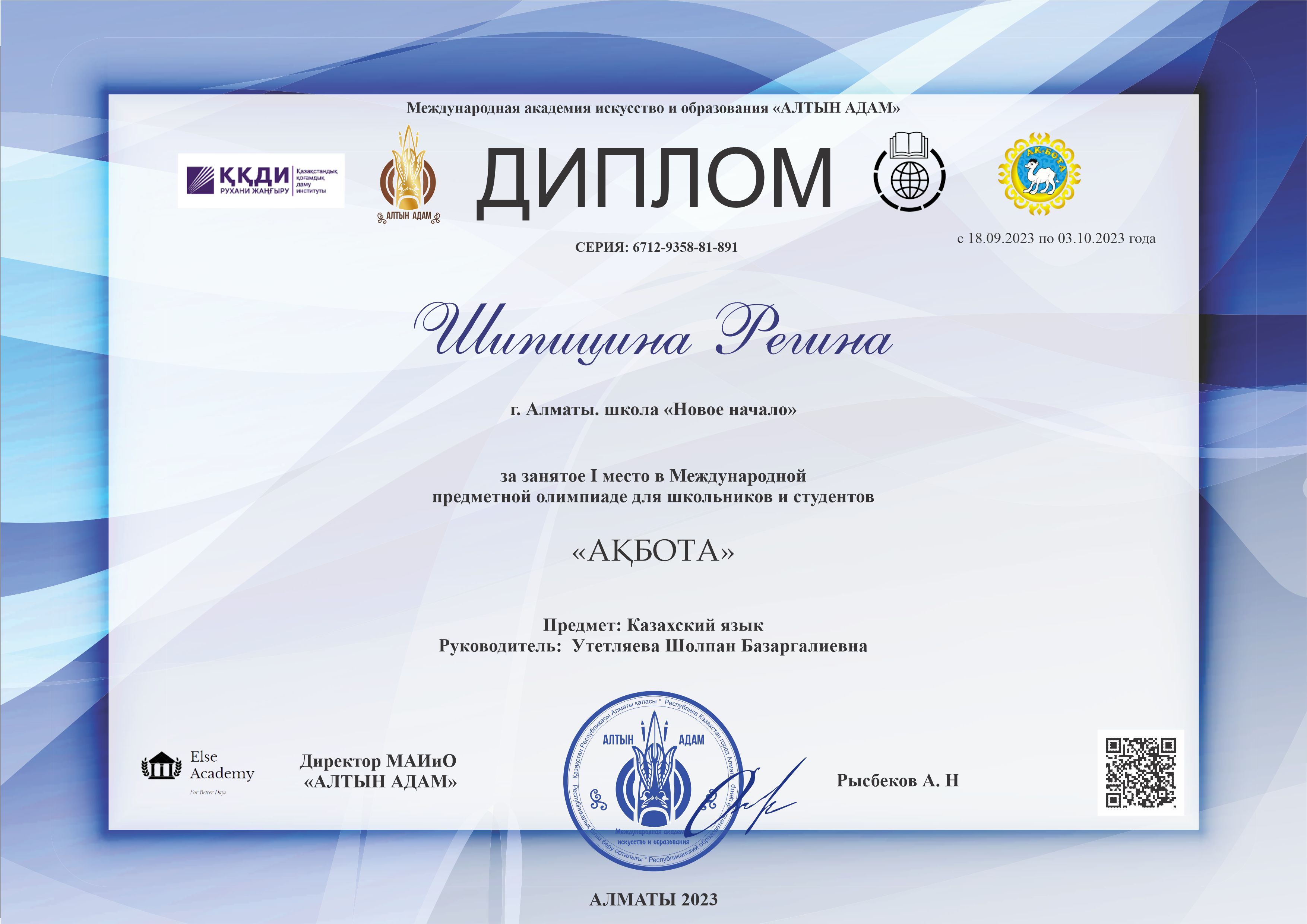 29 сентябрь 2023 0 1 2 3 4 5 I Международная предметная олимпиада "АКБОТА" для школьников Победитель в номинации - казахский язык и литература для 5 классов:Шипицина Регина.