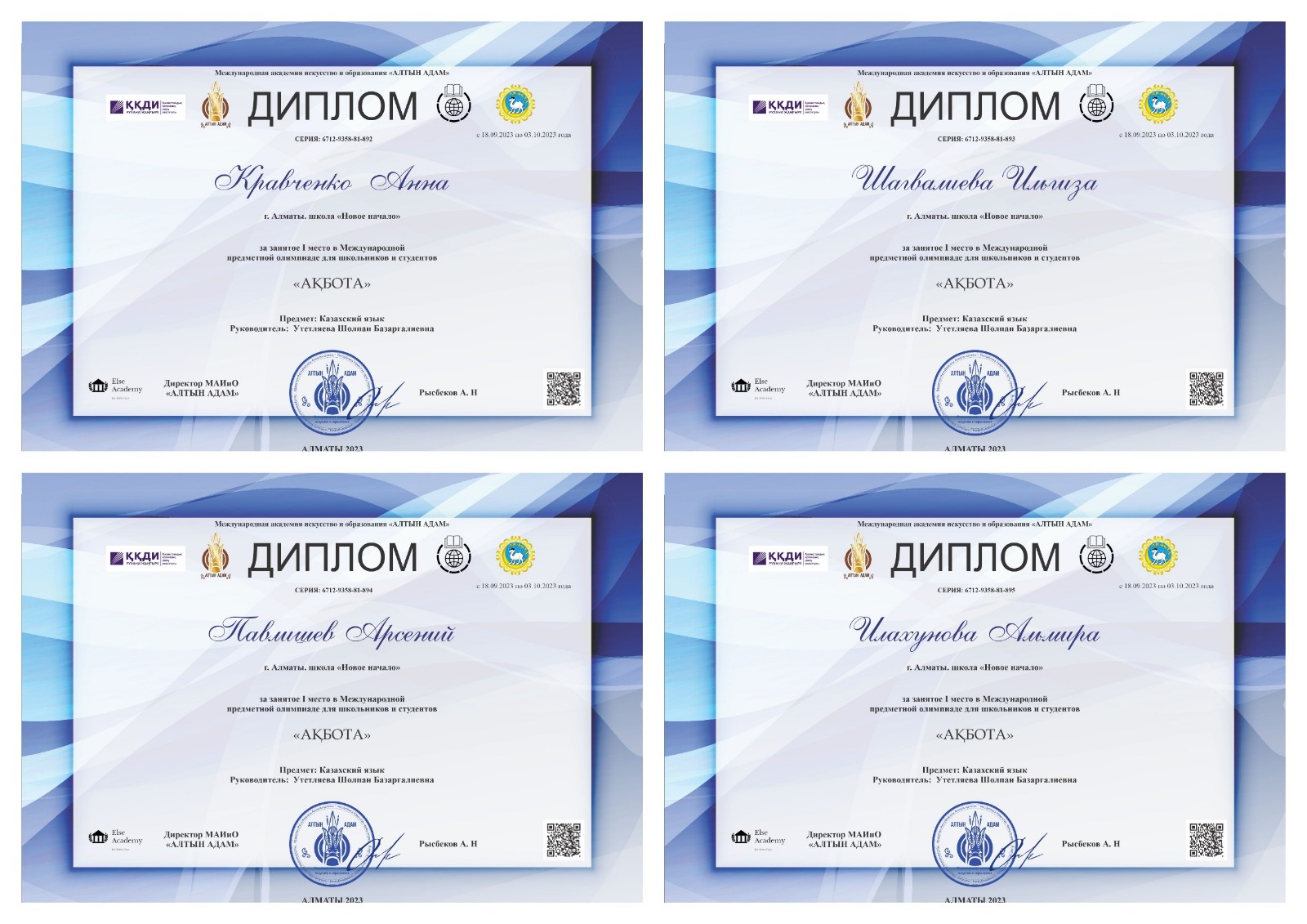 29 сентябрь 2023 0 1 2 3 4 5 I Международная предметная олимпиада "АКБОТА" для школьников Победители в номинации - казахский язык и литература для 8 классов:Илахунова Альмира,Павлишев Арсений,Шагвалиева Ильгиза,Кравченко Анна.
