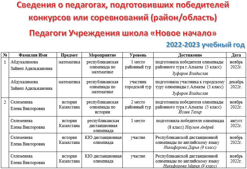 Педагоги подготовившие победителей олимпиад в 2022-2023 гг » «Учреждение школа «Новое начало»»